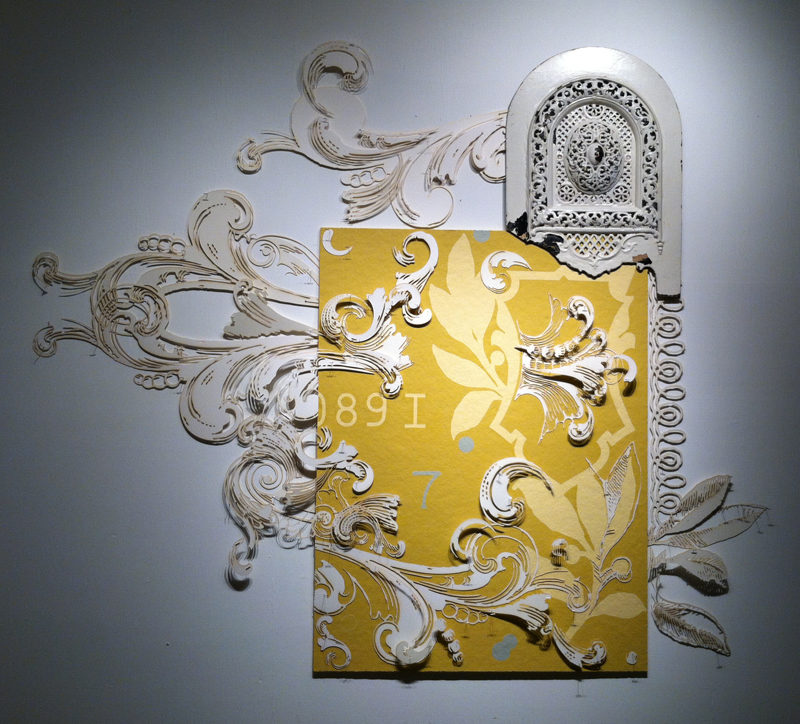 Hyperdulia (IMPRINT) from the “Queen Anne’s Lace” series, Variable dimensions 68 inches x 78 inches, 300lb paper, latex on homasote, fireplace grill, T-pins