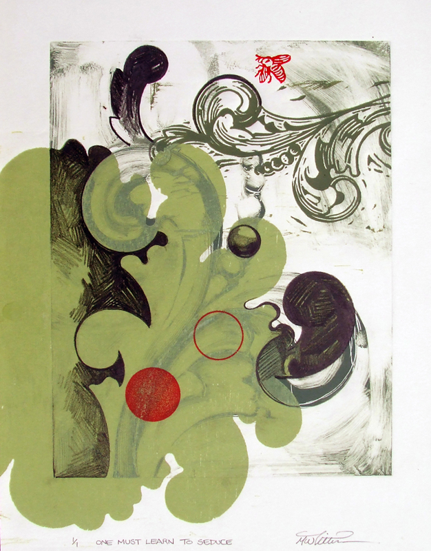 One Must Learn to Seduce, Mono-type, Wood-cut, Hand-carved rubber stamp, Prismacolor, and Graphite, 12 inches x 10 inches